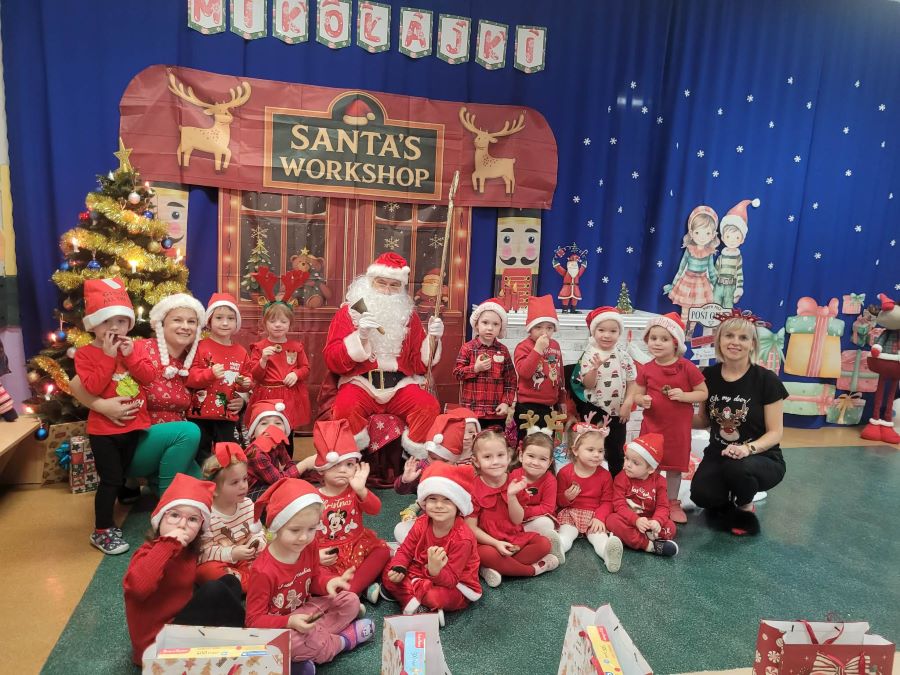 „Mikołajki” to dzień, na który wszystkie dzieci czekają z niecierpliwością! W naszym przedszkolu zapanowała prawdziwa magia, a uśmiechy nie schodziły z twarzy najmłodszych przedszkolaków. Tego dnia od rana w przedszkolu panował gwar, a wszystkie dzieci ubrane były w czerwone mikołajkowe stroje, by powitać wyjątkowego gościa.Z dźwiękiem dzwoneczków przybył do nas prawdziwy Święty Mikołaj! Dzieci z radością powitały Mikołaja piosenką, którą specjalnie dla niego przygotowały. Po obietnicy bycia grzecznymi przez cały rok, Święty Mikołaj obdarował każde dziecko prezentami i słodkościami.Wspólne zdjęcia, śmiech i wesołe tańce sprawiły, że był to dzień pełen radości, ciepła i niezapomnianych wrażeń.