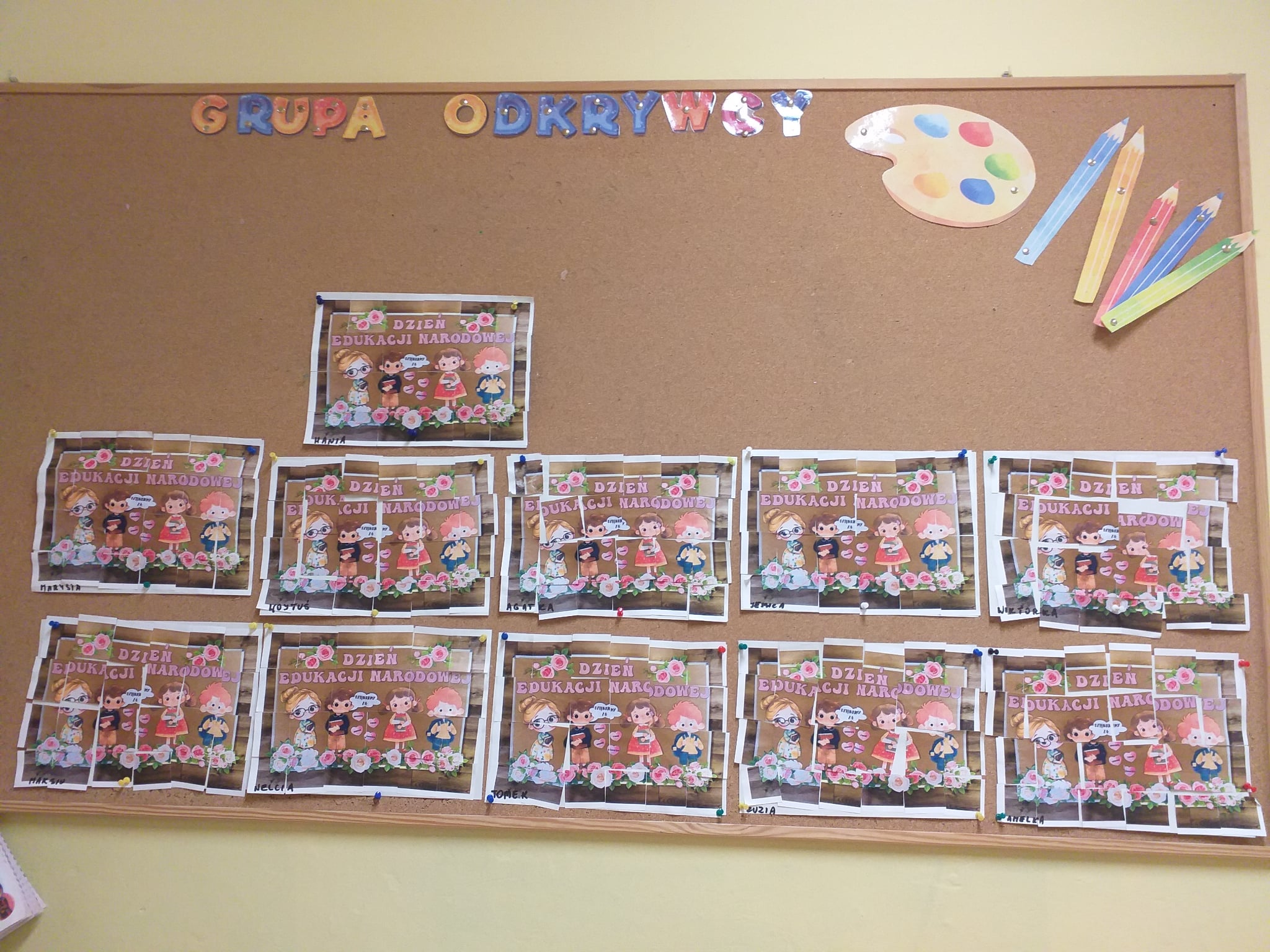 To polskie święto oświaty i szkolnictwa wyższego. Jest okazją do nagradzania wyróżniających się nauczycieli za szczególne osiągnięcia. Dzieci w przedszkolach oraz uczniowie w szkołach z okazji tego dnia biorą udział w uroczystościach, wręczają nauczycielom laurki, wspólnie świętują i cieszą się z obchodzonego święta. Dzień ten był obchodzony także przez dzieci z grupy Odkrywcy. Na początku nauczyciel przedstawił dzieciom kilka różnego rodzaju książek, z których nauczyciele czerpią wiedzę do przekazania dzieciom. Następnie dzieci rozwiązywały zadania matematyczne z książkami. Grały w grę Memory z obrazkami związanymi z edukacją. Wspólnie pozowały do pamiątkowej fotografii. Zrobiły sobie także pamiątkowe zdjęcie ze swoimi paniami.