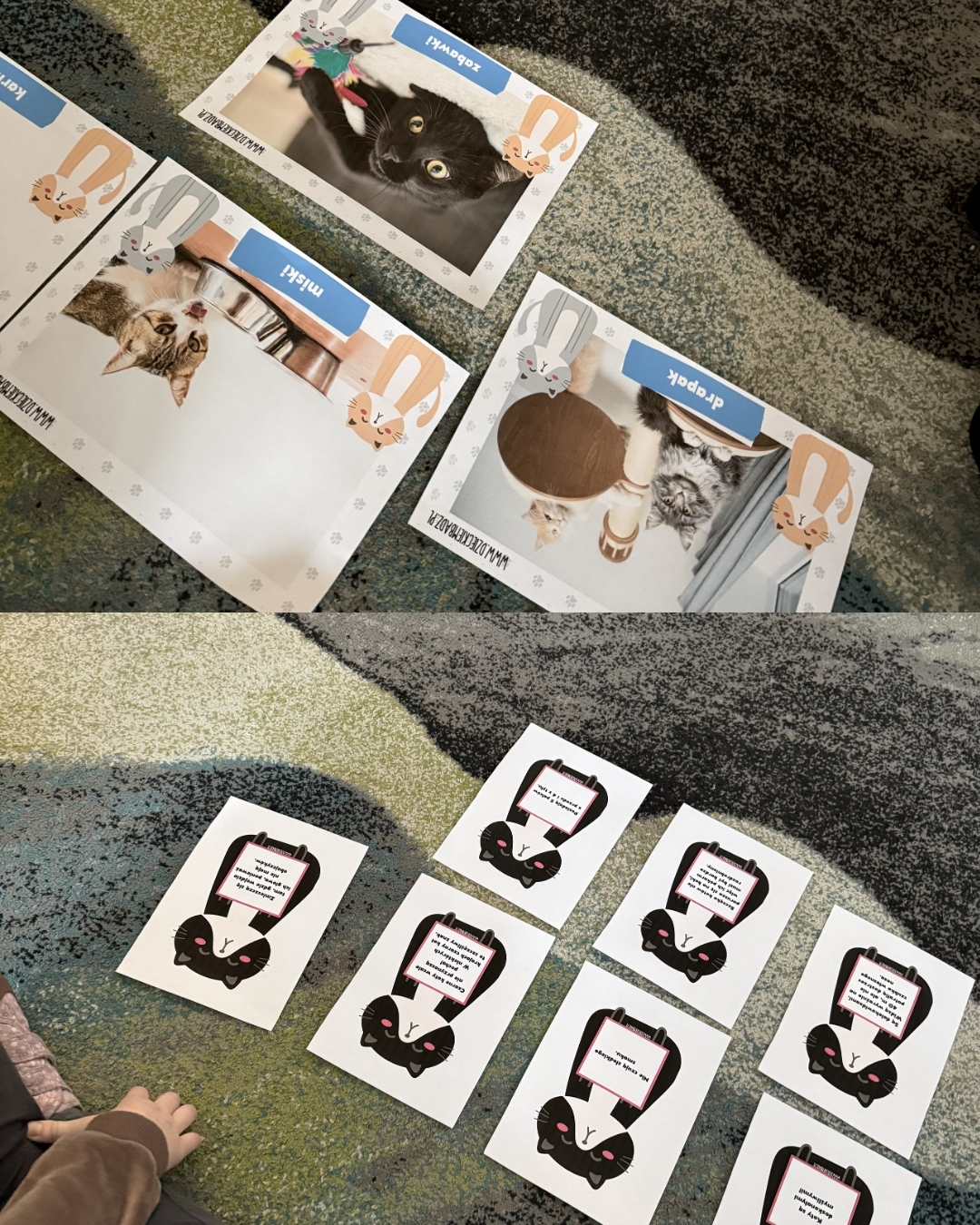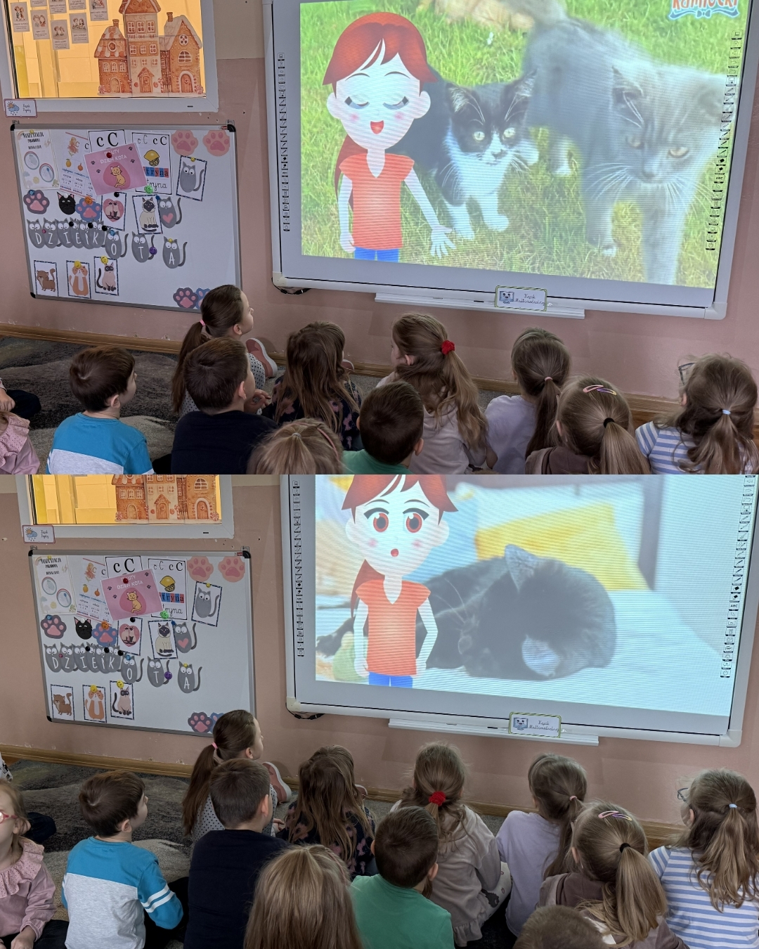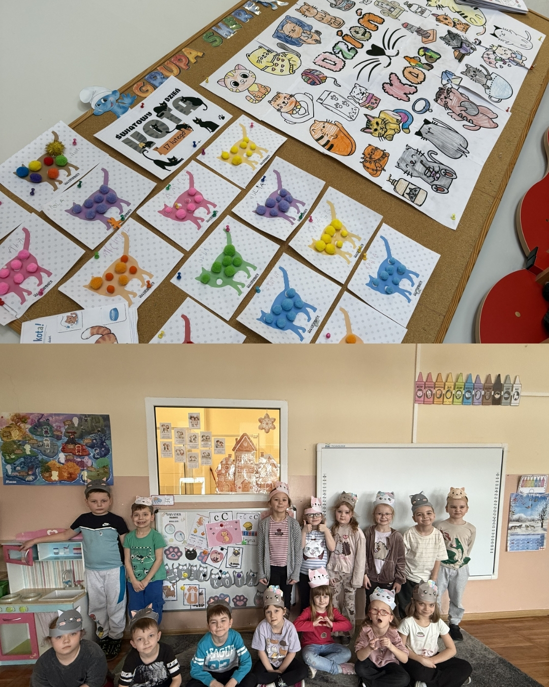 Dzieci bardzo ucieszyły się, gdy zobaczyły w kalendarzu zbliżający się Dzień Kota. Same przygotowały dekorację z tej okazji. Okazało się, że dużo osób z grupy ma w domach koty, dzięki temu doskonale wie jak należy o nie dbać i co trzeba robić, aby były szczęśliwe. Przedszkolaki obejrzały filmy edukacyjne dotyczące ras kotów, ciekawostek i faktów oraz wzięły udział w quizie wiedzy. Dodatkowo wykonały tematyczne karty pracy, prace plastyczne i stworzyły własne, pamiątkowe opaski na głowę.