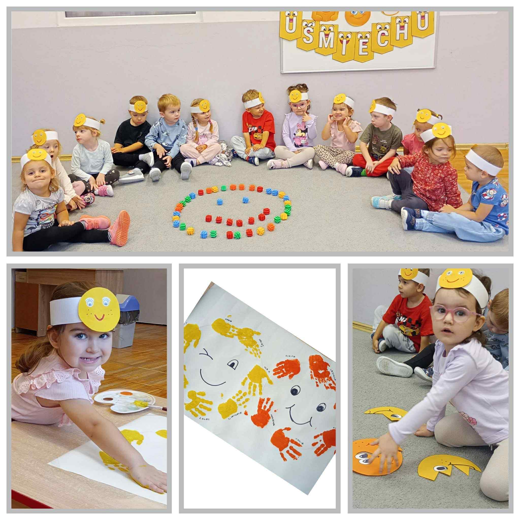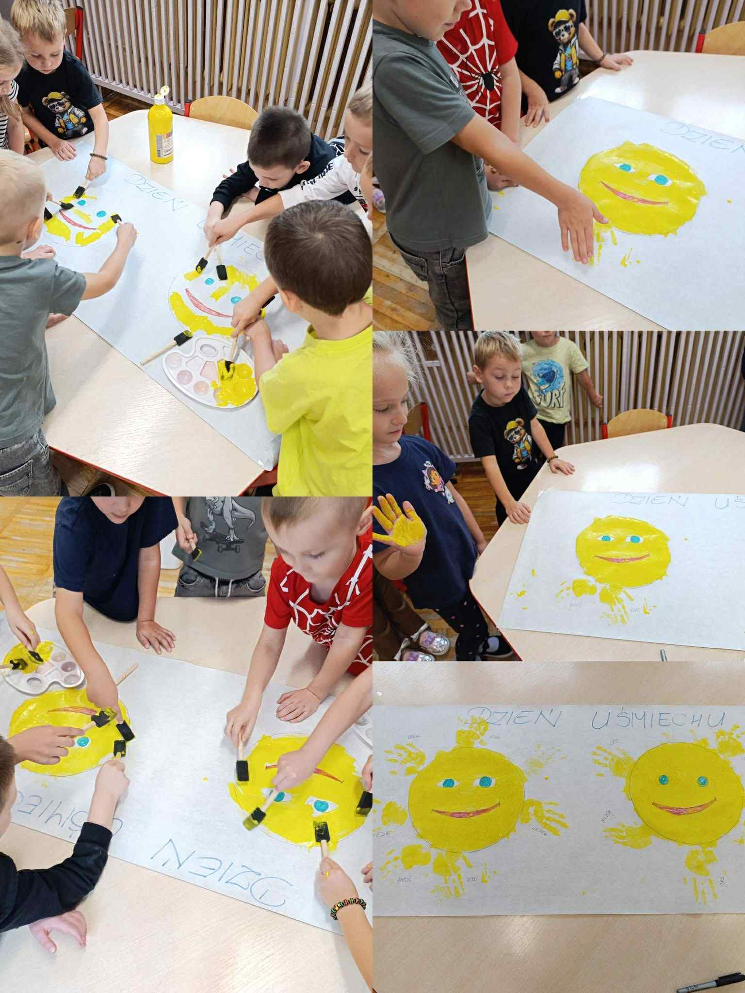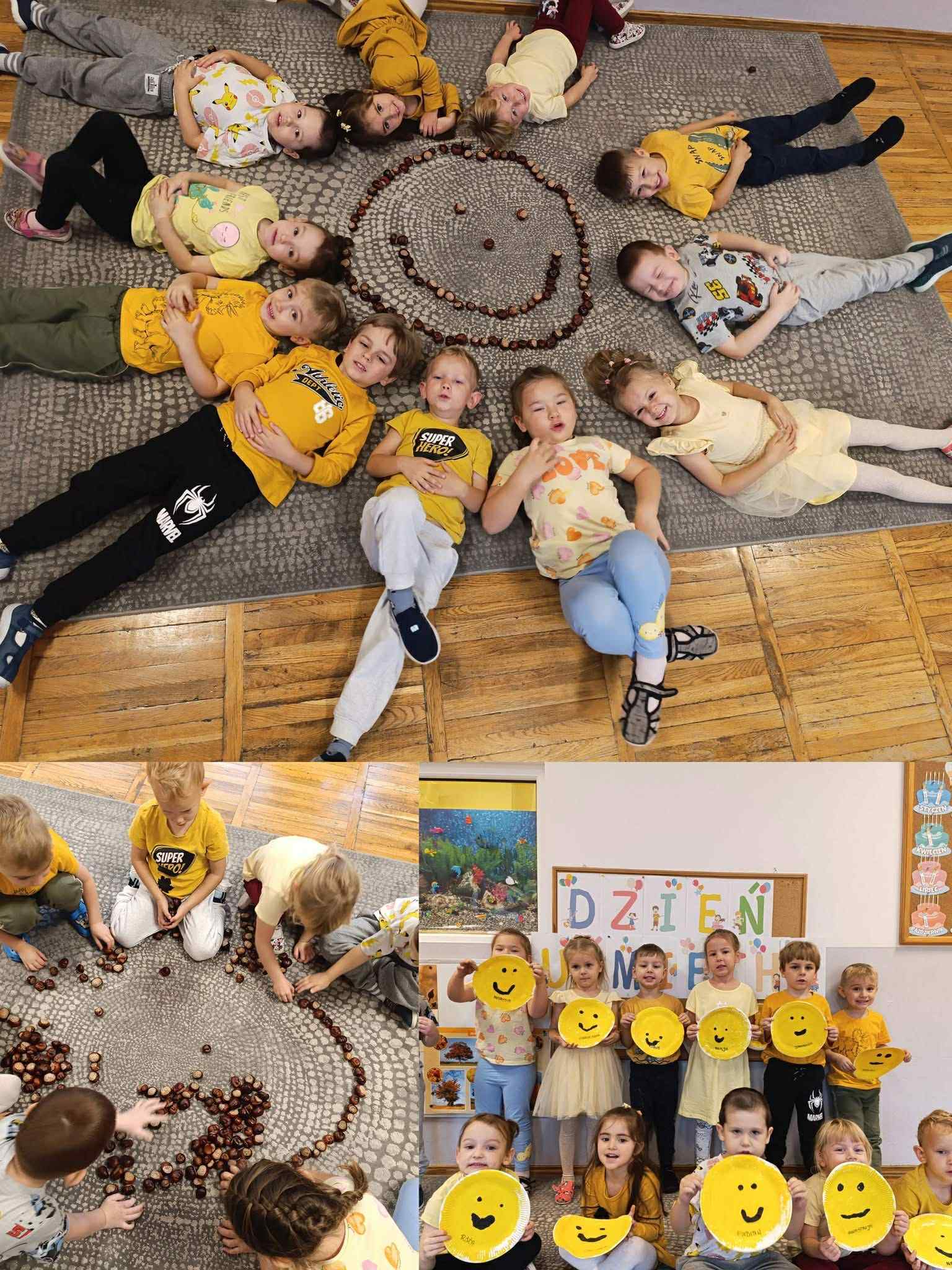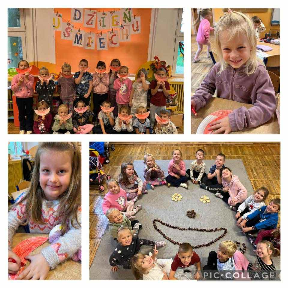 6 października w naszym przedszkolu od samego rana dominował kolor żółty, a to wszystko za sprawą obchodzonego „Światowego Dnia Uśmiechu”. Celem tego dnia jest zachęcanie do okazywania życzliwości, sprawiania radości innym oraz przypomnienie jak ważny jest uśmiech każdego dnia. Nasze przedszkolaki w tym dniu wykonały plakaty z uśmiechniętymi buźkami, układały uśmiechnięte buźki z różnych przedmiotów oraz podejmowały inne aktywności związane z tym ważnym dniem.