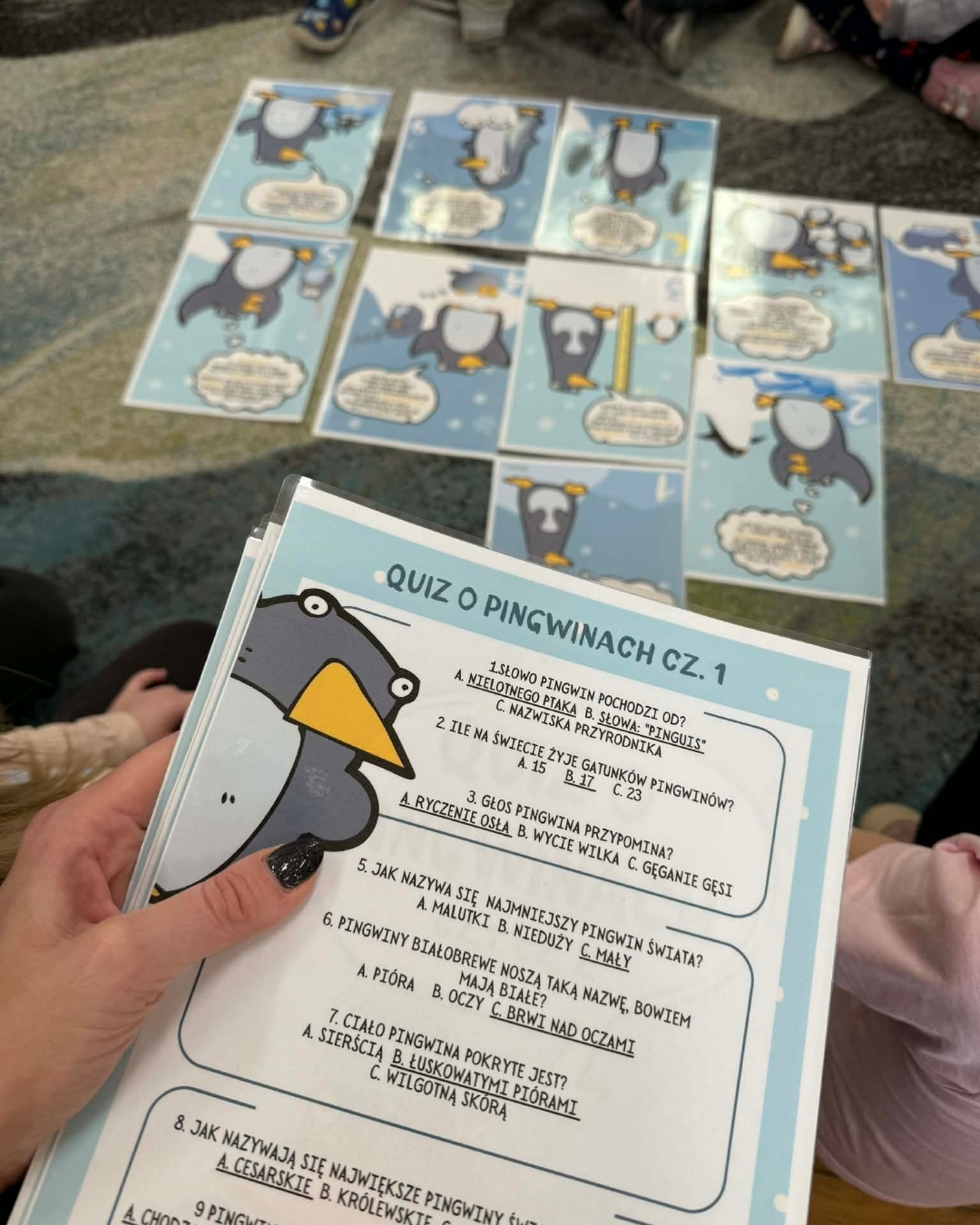 Dzień Wiedzy o Pingwinach był pełny radości, śmiechu, rywalizacji, ale przede wszystkim nauki. Matematyka jest ukryta wszędzie! Dzieci poznały ciekawostki o pingwinach, wzięły udział w quizie wiedzy oraz ćwiczeniach matematycznych i logicznych. Przy pomocy miarki mierzyły się wspólnie, żeby sprawdzić czy pingwiny są od nich mniejsze czy większe, liczyły przy użyciu klamerek, szukały brakujących liter do słów, co było okazją do doskonalenia umiejętności czytania. Największą atrakcją okazała się gra edukacyjna “Sardynki dla Kostków”, która wzbudziła ogromne zainteresowanie, zaangażowanie i emocje. Uczestnicy wzajemnie się dopingowali i radością reagowali na każde zwycięstwo. W grze dzieci doskonaliły liczenie, pamięć i logiczne myślenie. Emocje towarzyszyły dzieciom nawet podczas swobodnej zabawy, gdyż poprosiły o możliwość zagrania w tą grę jeszcze raz. Przedszkolaki wykonały także kreatywne prace plastyczne. Dzieci stwierdziły, że są wielkimi fanami pingwinów. Była to doskonała okazja do tego, by stwierdzić, że matematyka jest wszędzie!