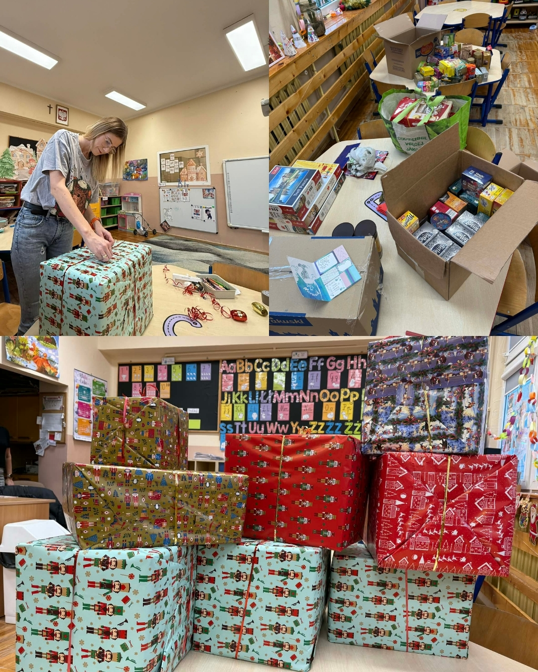 Bardzo dziękujemy wszystkim osobom o wielkim sercu, które dołączyły się do zbiórki kawy, herbaty oraz artykułów piśmienniczych, krzyżówek, puzzli itp. Dzięki Waszemu zaangażowaniu udało się zebrać bardzo dużo darów. Powstały świąteczne paczki dla pensjonariuszy DPS we Wronikowie. Paczki zostały przekazane w ramach Tygodnia Życzliwości wraz z laurkami od dzieci i drobnymi upominkami wykonanymi przez każdą z grup oraz klasy 1. Dzięki Państwa wsparciu Kiermaszu Bożonarodzeniowego udało się zakupić świąteczne upominki dla pensjonariuszy. Ta edycja akcji chyba pobiła rekord paczek, ponieważ ciężko było przetransportować taką ilość. Dla dzieci z naszej placówki również DPS przygotował prezenty. Zostały przekazane słodkości oraz piękne, własnoręcznie wykonane dekoracje. Bardzo dziękujemy i cieszymy się z kolejnego roku naszej współpracy. Dziękujemy za to, że kolejny raz mogliśmy wspólnie stworzyć coś wyjątkowego i podarować pensjonariuszom odrobinę radości w ten świąteczny czas.