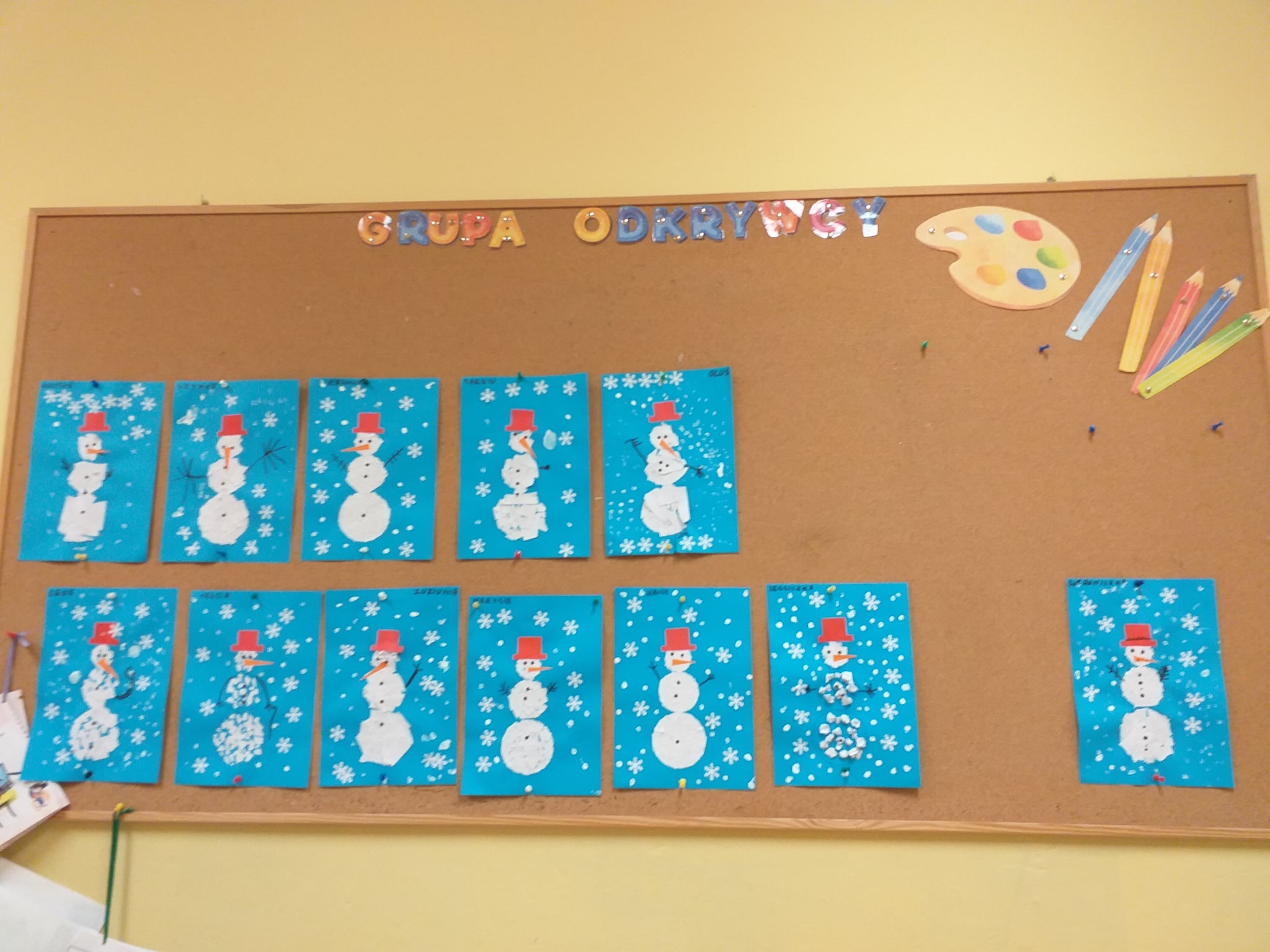 Od początku roku szkolnego dzieci z grupy Odkrywcy realizują Ogólnopolski Projekt Edukacyjny „Kreatywna Matematyka”. Jak sama nazwa wskazuje, jego celem jest innowacyjne i pomysłowe podejście do edukacji matematycznej poprzez wielozmysłowe poznawanie świata liczb, figur geometrycznych, działań oraz zagadnień matematycznych. Do tej pory wykonaliśmy 5 zadań zaproponowanych przez organizatorów projektu. Pierwsze zadanie polegało na układaniu patyków w szeregi, określaniu ich długości, a następnie ich mierzeniu. Drugie zadanie polegało na ustalaniu wyniku odejmowania kasztanów, które znikały pod jesiennym liściem. Trzecie zadanie polegało na dorysowywaniu dowolnych elementów do konturu koła, tak aby stworzyć pewien obraz. Czwarte zadanie polegało na rysowaniu na kartkach poznanych przez dzieci wzorów geometrycznych, figur geometrycznych, cyfr i znaków matematycznych. Piąte zadanie stanowiło wykonanie pracy plastycznej - obrazka z bałwankiem. Trzeba było wykleić kontur bałwanka kawałkami białego papieru, dokleić mu potrzebne elementy, a na tle umieścić śnieżynki. Zadaniem dzieci było także liczyć wszystkie elementy wykonywanej przez siebie pracy plastycznej.