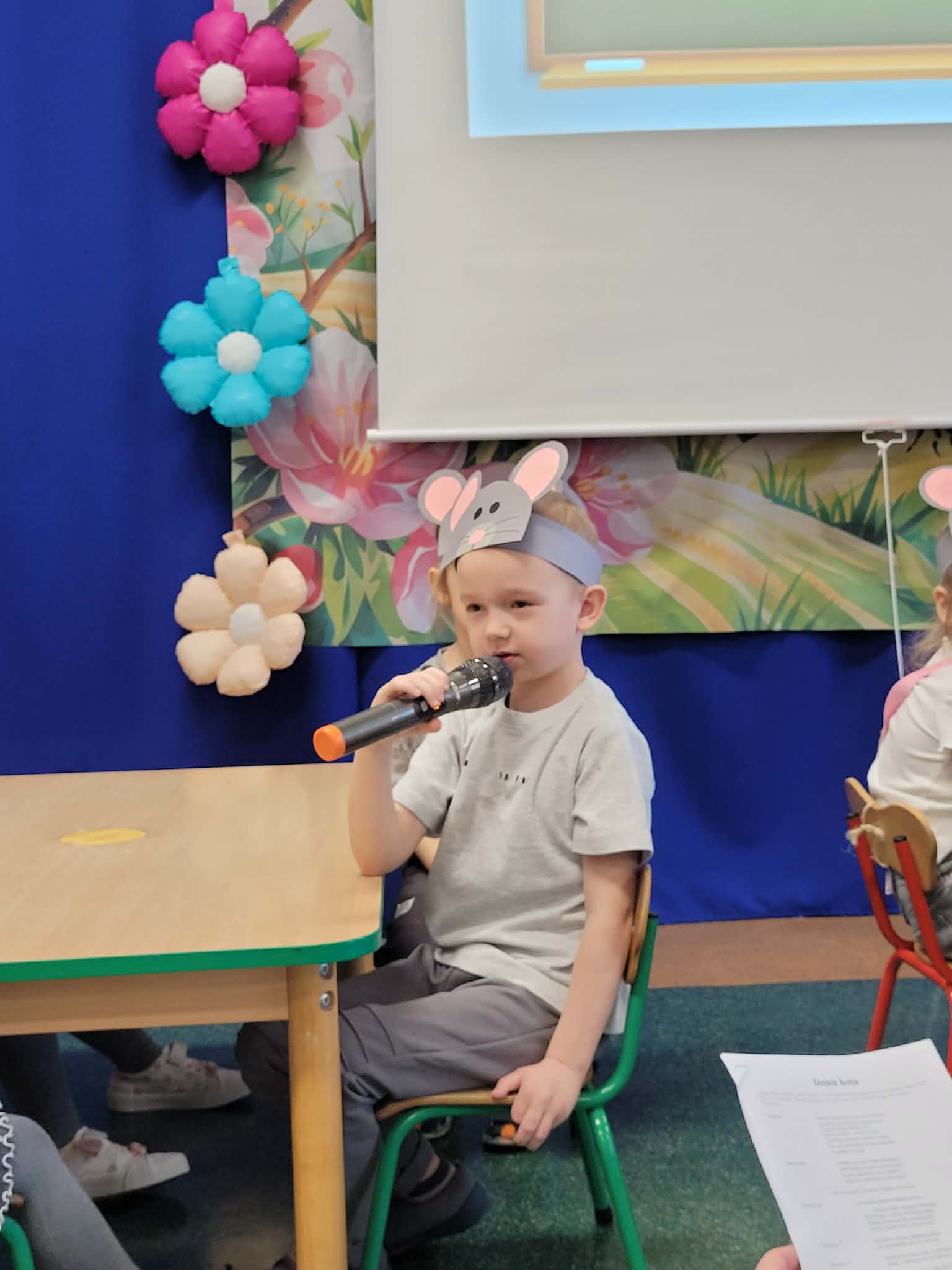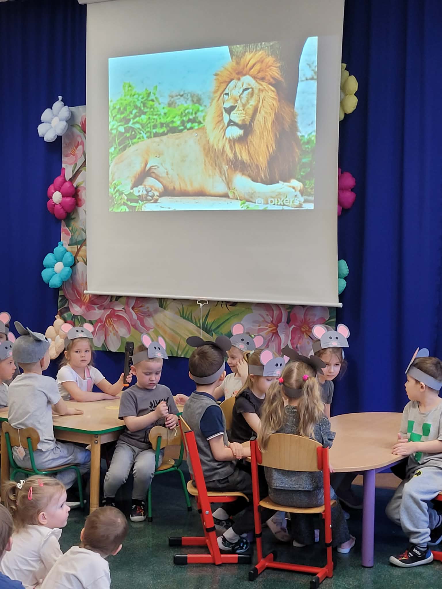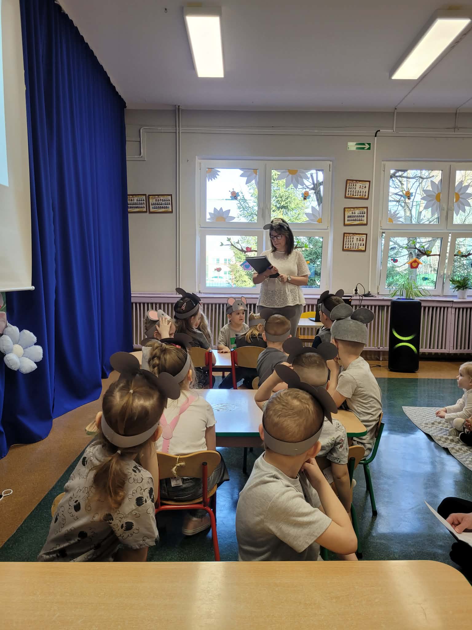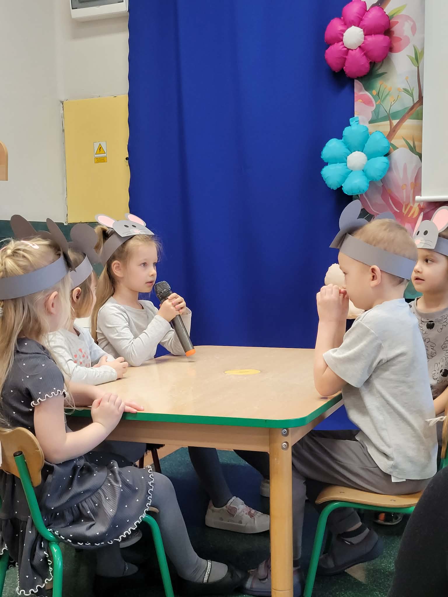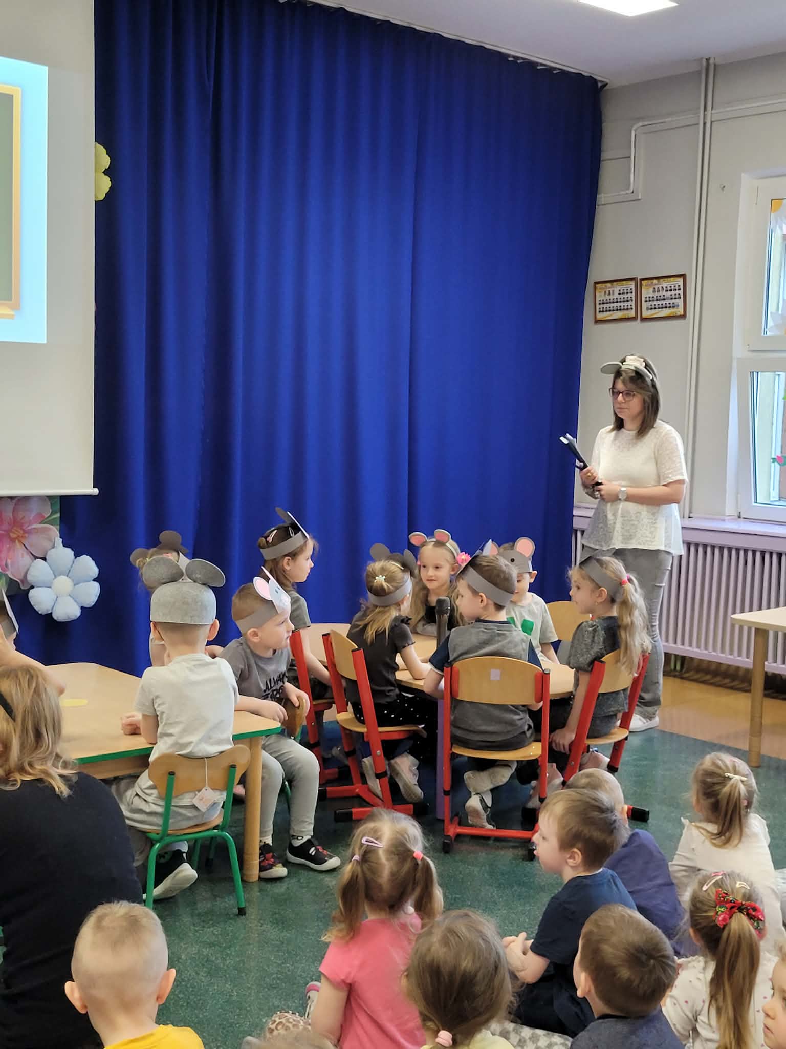 Z okazji Dnia Kota dzieci z grupy Słoneczka oraz Misie zaprosiły wszystkie przedszkolaki do szkoły myszek. W przedstawieniu zaprezentowały wierszyki oraz piosenkę „Kot pomocnik” za co zostały nagrodzone gromkimi brawami.