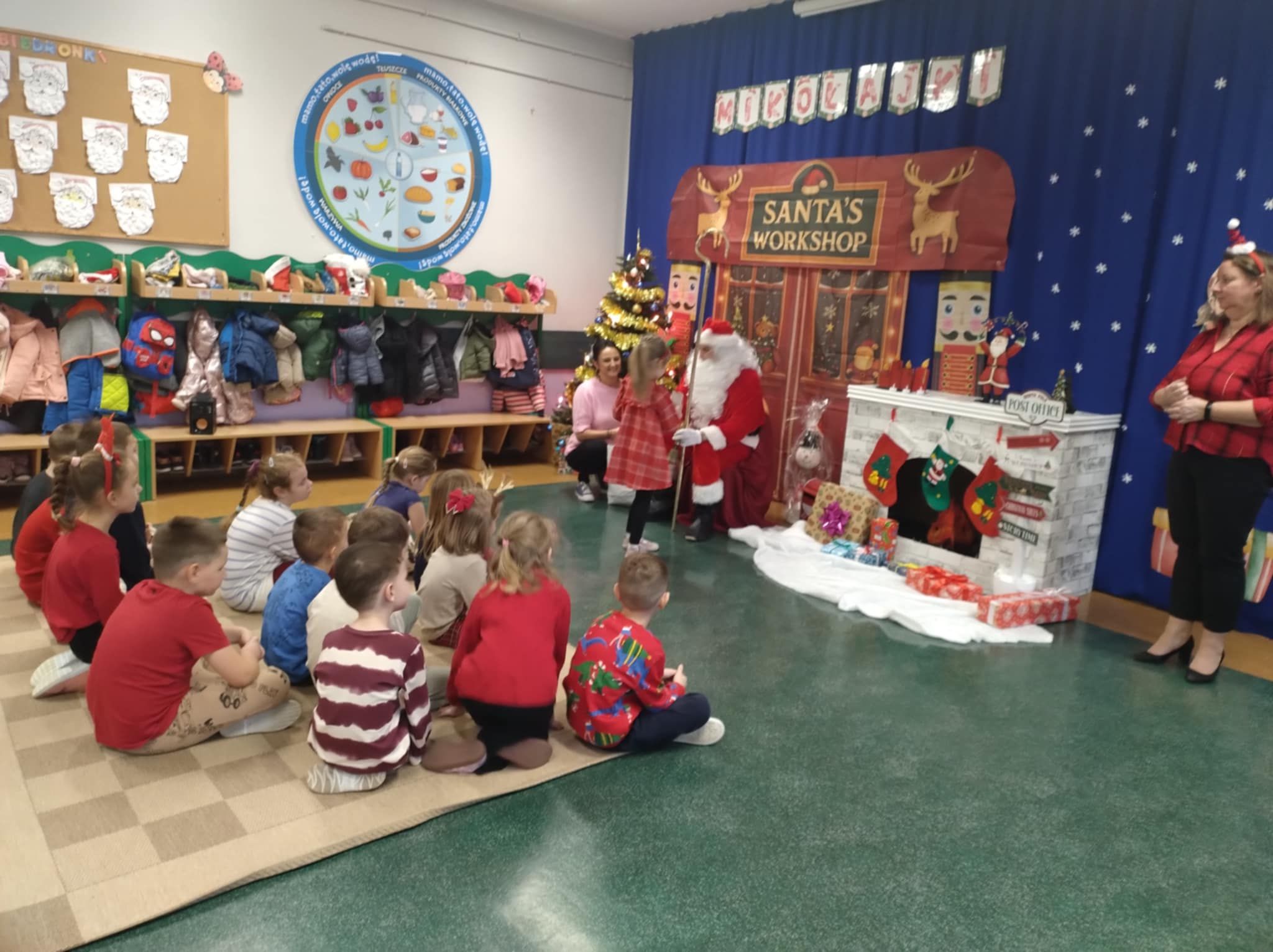 5 grudnia w przedszkolu był pełen magii i radosnego oczekiwania. Już od rana dzieci z niecierpliwością wypatrywały niezwykłego gościa. Święty Mikołaj w czerwonym płaszczu, z białą brodą i wielkim workiem prezentów siedział i czekał na dzieci na holu przedszkolnym . Na twarzach przedszkolaków pojawiły się szerokie uśmiechy, a niektórzy z wrażenia otwierali oczy ze zdumienia. Mikołaj przywitał dzieci ciepłymi słowami i chwilę z nimi porozmawiał. Przedszkolaki z dumą zaprezentowały mu piosenkę, którą nauczyły się na tę okazję. Mikołaj uważnie słuchał, chwalił ich za odwagę, każde dziecko otrzymało drobny upominek oraz życzenia świąteczne. Na zakończenie dzieci zrobiły sobie pamiątkowe zdjęcia z Mikołajem i obiecały, że przez cały rok będą grzeczne.