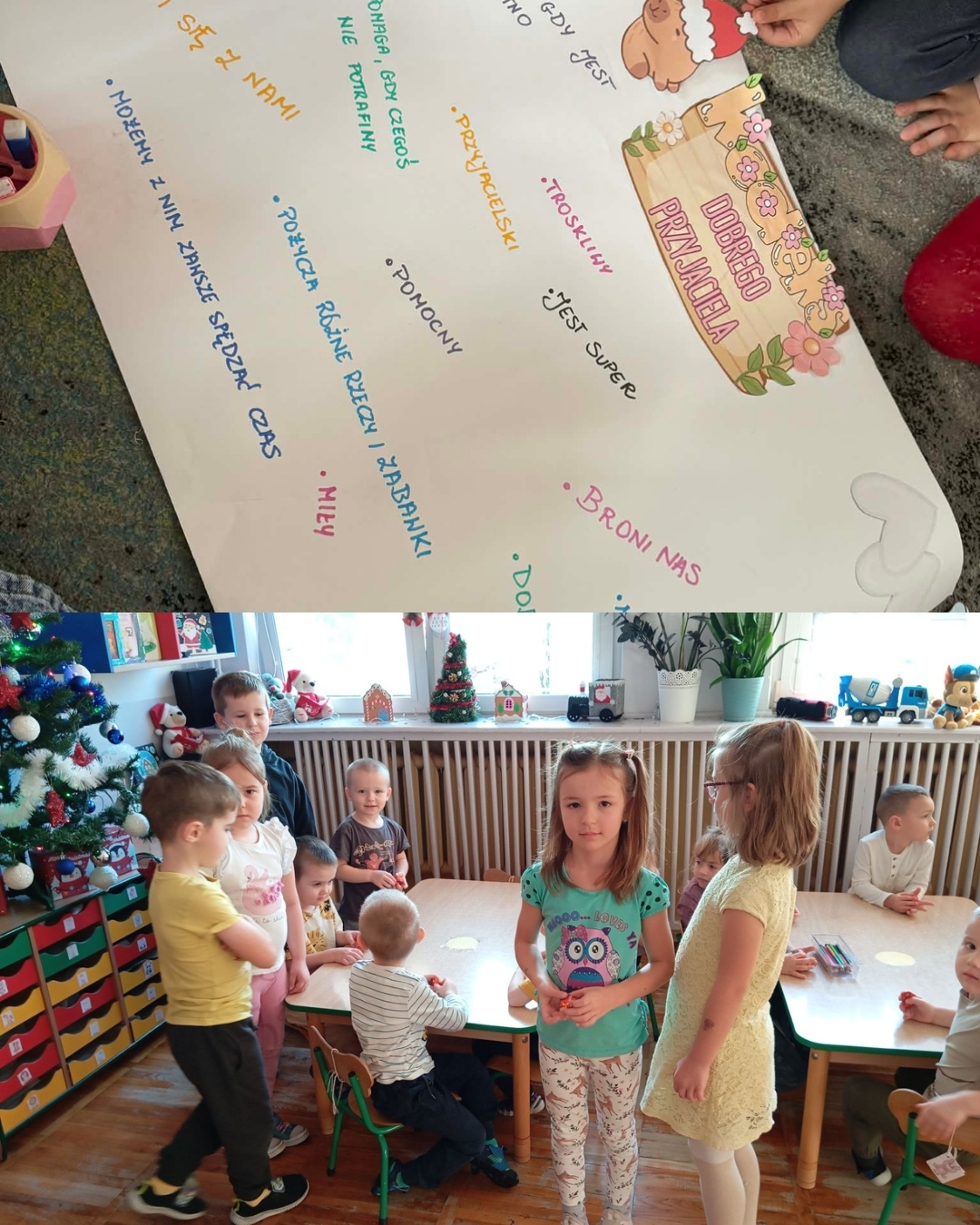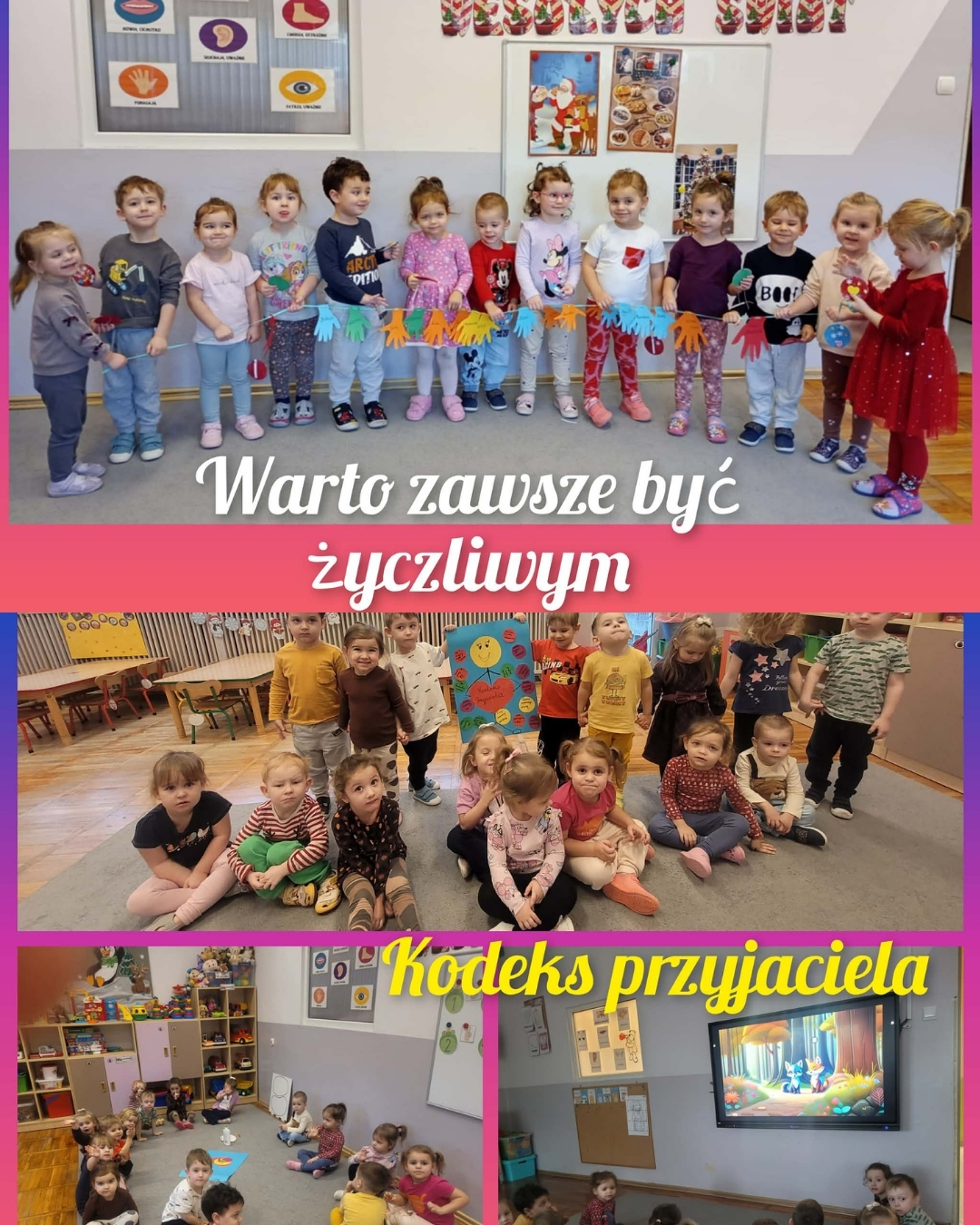 Tydzień życzliwości w naszym przedszkolu to już tradycja. Jest on autorskim projektem edukacyjnym realizowanym co roku w naszej placówce. Uczy on tolerancji, akceptacji, szacunku do kolegów, rówieśników, starszych, chorych i ubogich. Każdy dzień dotyczy aspektu życzliwości wobec różnych osób. W tym roku przyłączyły się do przedszkola również klasy I. Dodatkowymi działaniami jest akcja charytatywna „Herbatka dla seniora na zimowe wieczory” oraz spektakl niespodziankowy w wykonaniu nauczycieli dla przedszkolaków. Wszystkie grupy wzorowo wykonały wszystkie zadania. Najbardziej przyjemne według dzieci było obdarowywanie siebie wzajemnie prezentami oraz przedstawienie – niespodzianka.