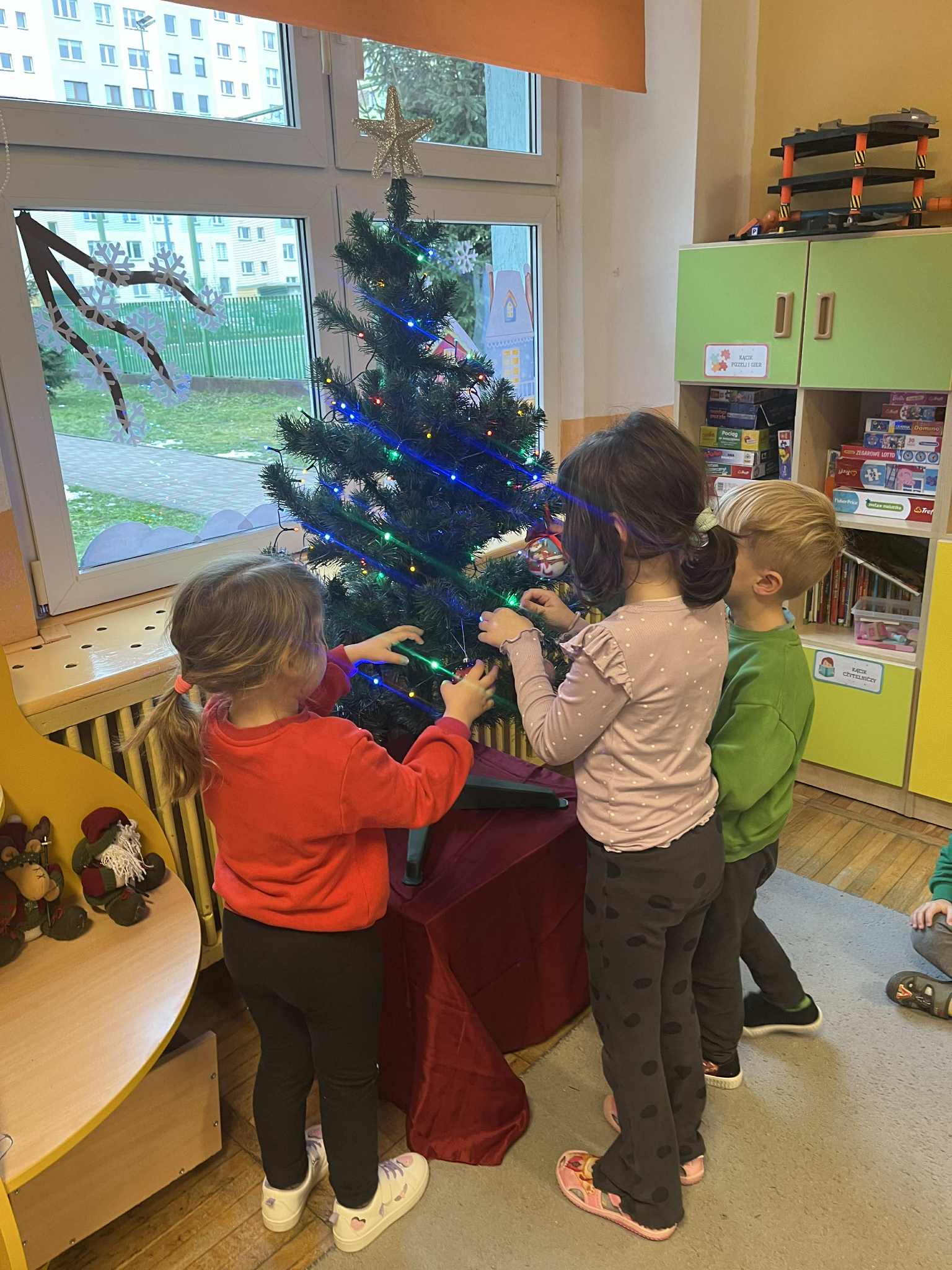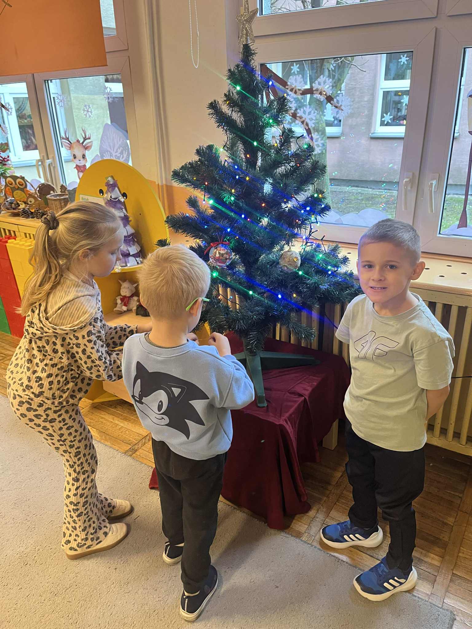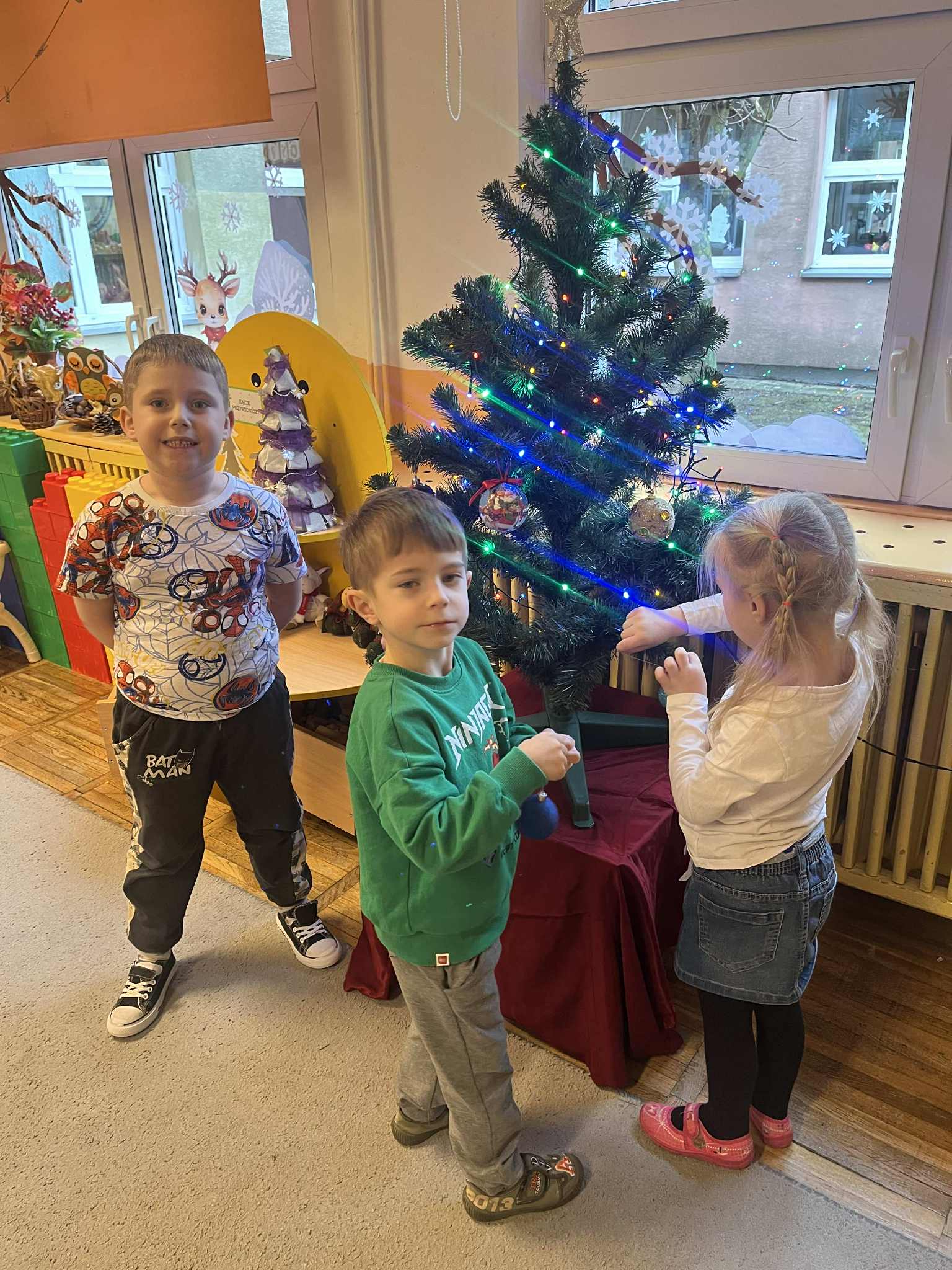 Święta Bożego Narodzenia wiążą się z tradycją ubierania świątecznego drzewka. W grupie Żabki również nie mogło zabraknąć tego rytuału. Dzień ubierania choinki w przedszkolu jest dniem wyjątkowym. Dzieci z wielkim zaangażowaniem zawieszały choinkowe ozdoby. Ileż było radości wśród dzieci a w sali od razu zrobiło się świątecznie. Drzewko zostało przystrojone bardzo szybko, wygląda wyjątkowo i przypomina nam, że Święta Bożego Narodzenia już tuż, tuż…Wszystkie dzieci jednogłośnie stwierdziły, że choinka jest prześliczna, a na koniec nie mogło obejść się bez grupowego zdjęcia z świątecznym drzewkiem.