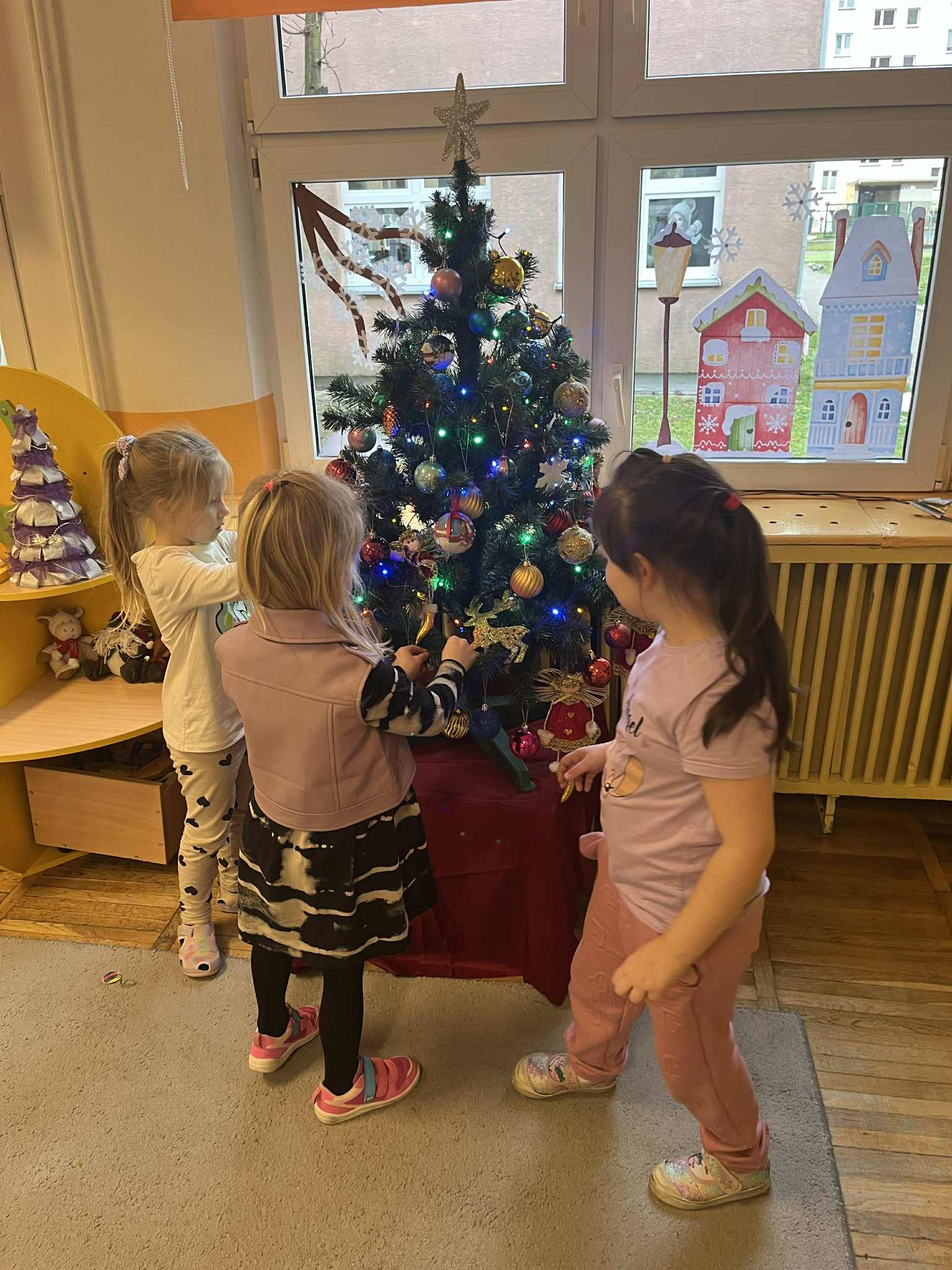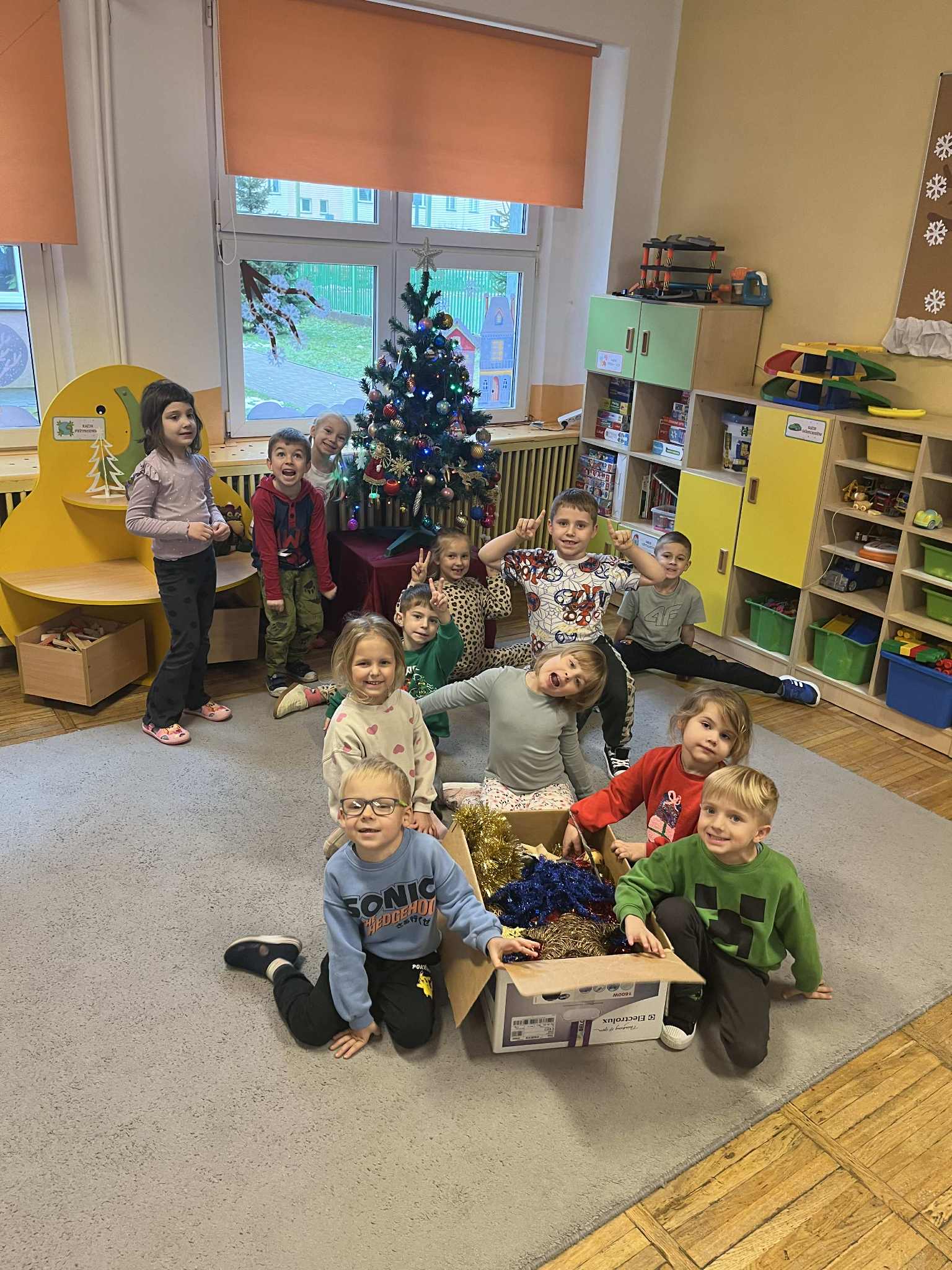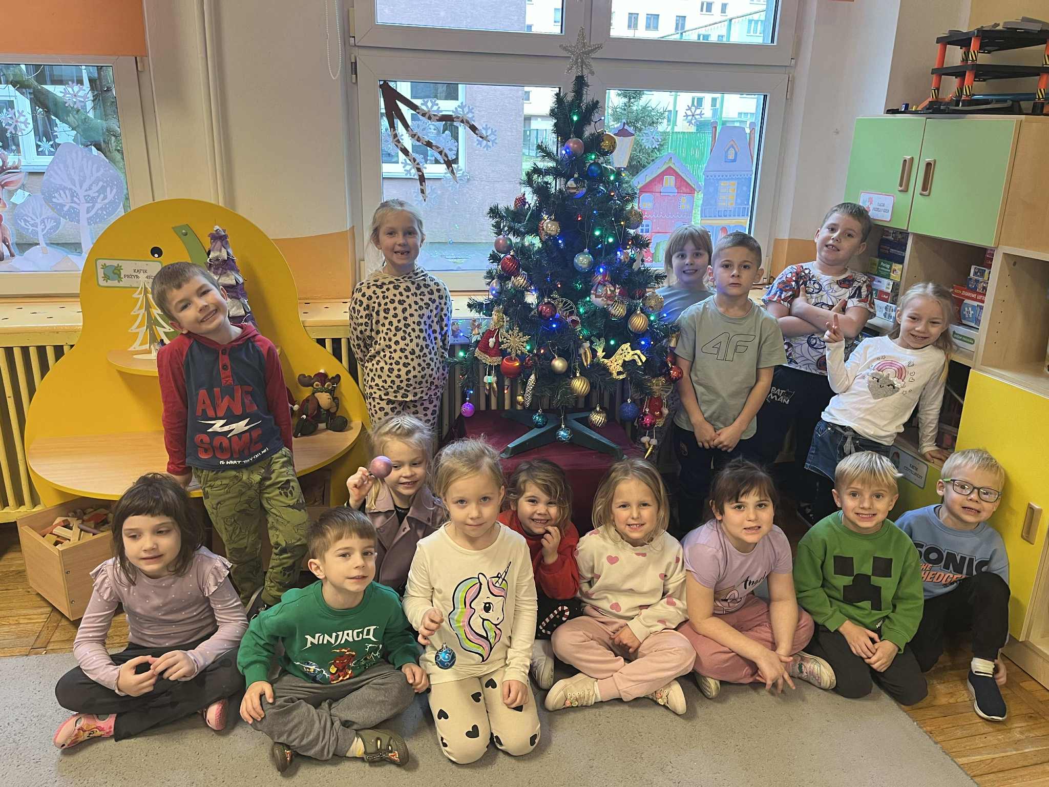 Święta Bożego Narodzenia wiążą się z tradycją ubierania świątecznego drzewka. W grupie Żabki również nie mogło zabraknąć tego rytuału. Dzień ubierania choinki w przedszkolu jest dniem wyjątkowym. Dzieci z wielkim zaangażowaniem zawieszały choinkowe ozdoby. Ileż było radości wśród dzieci a w sali od razu zrobiło się świątecznie. Drzewko zostało przystrojone bardzo szybko, wygląda wyjątkowo i przypomina nam, że Święta Bożego Narodzenia już tuż, tuż…Wszystkie dzieci jednogłośnie stwierdziły, że choinka jest prześliczna, a na koniec nie mogło obejść się bez grupowego zdjęcia z świątecznym drzewkiem.