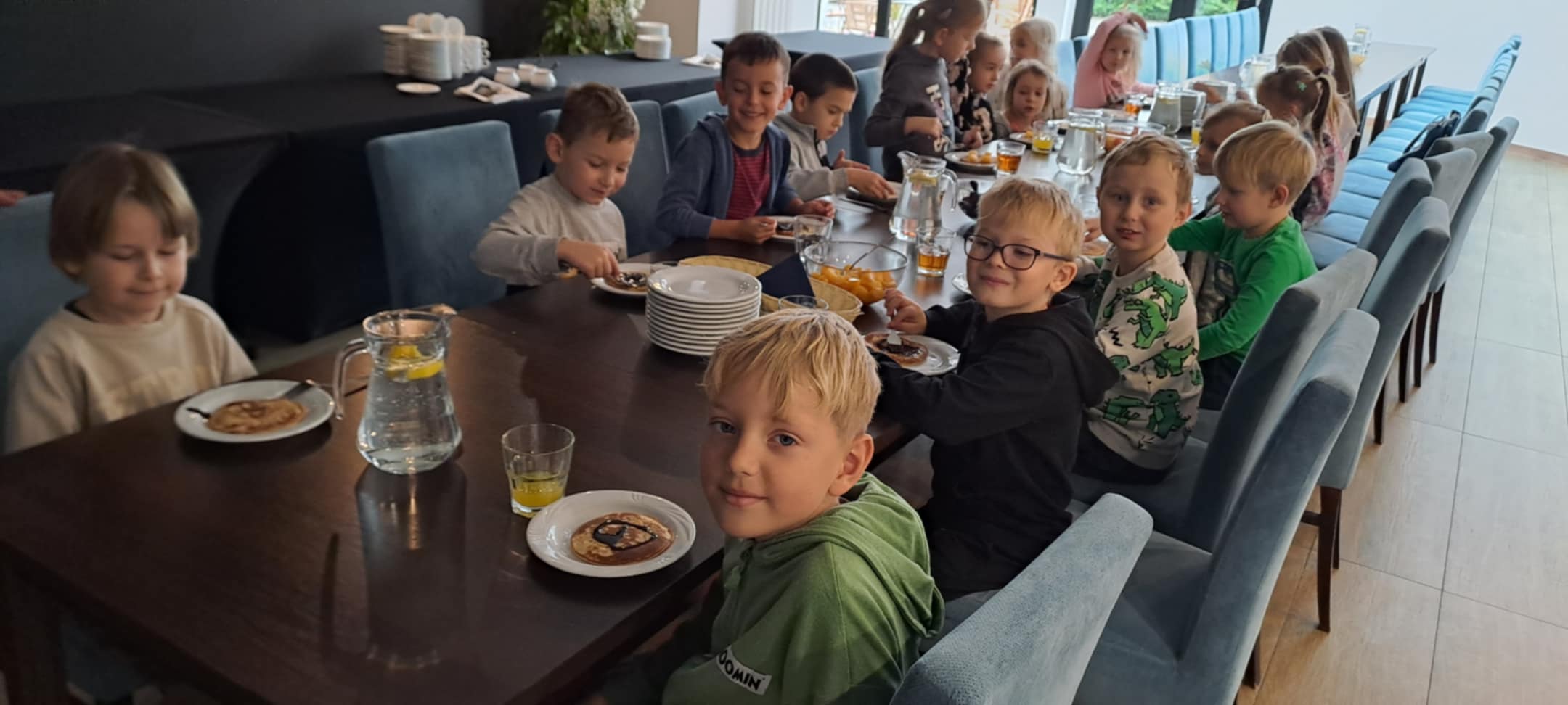 Dnia 07.10.2025 r. dzieci z grup „Motylki” i „Odkrywcy” wybrali się na wycieczkę do Hotelu Sport w Bełchatowie, aby wziąć udział w warsztatach „Małego Hotelarza”. Podczas zajęć dzieci miały okazję zwiedzić zakamarki hotelu na co dzień niedostępne dla gości, poznały pracę recepcji i obsługi hotelowej, uczestniczyły w zajęciach integracyjnych, w tym w grach i zabawach edukacyjnych oraz aktywnie uczestniczyły w warsztatach kulinarnych, przygotowując własne pankejki. Dzieci były zdyscyplinowane, chętne do współpracy i aktywnie uczestniczyły we wszystkich zajęciach.