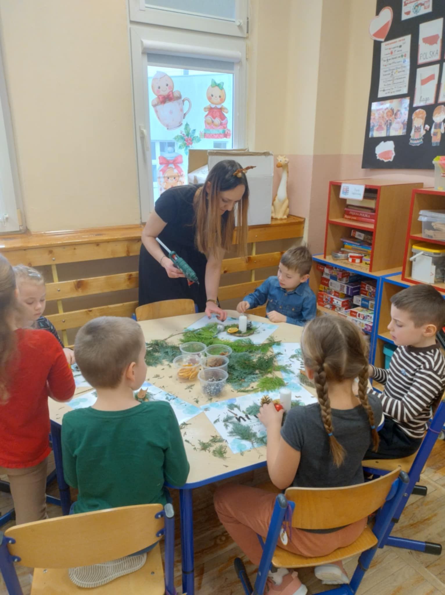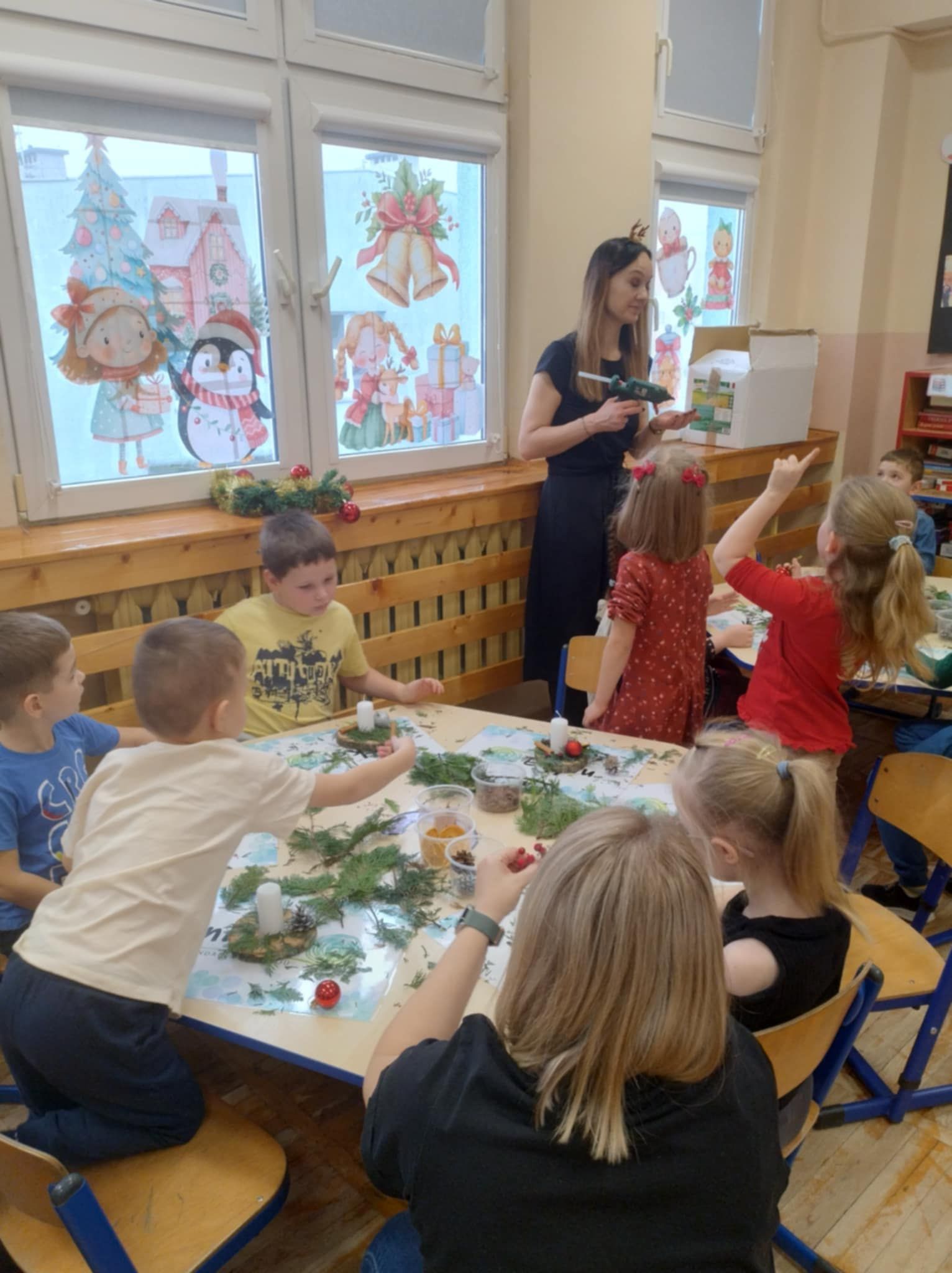 4 grudnia w naszej grupie odbyły się wyjątkowe warsztaty mikołajkowe z robienia stroików na świąteczny stół podczas których dzieci, tworzyły własne świąteczne stroiki. Na początku zajęć przedszkolaki poznały różne materiały dekoracyjne — gałązki świerku, szyszki, wstążki, suszone owoce, małe ozdoby oraz bezpieczne elementy mocujące. Panie prowadzące opowiedziały skąd biorą się tradycje związane ze stroikami i dlaczego są one symbolem świątecznego nastroju. Następnie dzieci rozpoczęły samodzielną pracę. Z dużym zaangażowaniem komponowały własne dekoracje, ćwicząc przy tym kreatywność, zdolności manualne oraz cierpliwość.