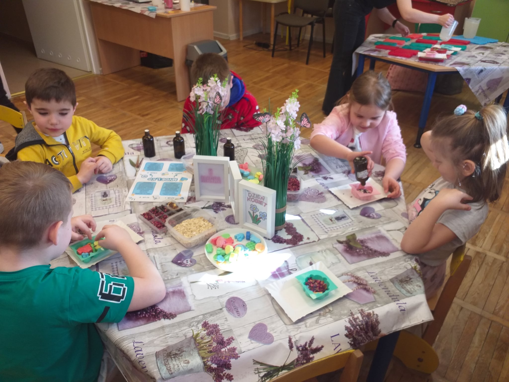 W środę dzieci z grupy Odkrywcy uczestniczyły w warsztatach mydlarskich z okazji Dnia Kobiet. Celem warsztatów było wykonanie mydełka własnego pomysłu. Na początku skomponowały własne mydełko z przeznaczonych do tego materiałów. Następnie słuchały prelekcji na temat mydła, jego właściwościach i zastosowaniu. Słuchały wiadomości o bakteriach i o tym, że trzeba przestrzegać zasad higieny. Uczyły się wierszyka o tym jak poprawnie myć ręce. Na zakończenie zapakowały gotowe, wykonane przez siebie mydełko do pięknie przyozdobionych torebeczek.